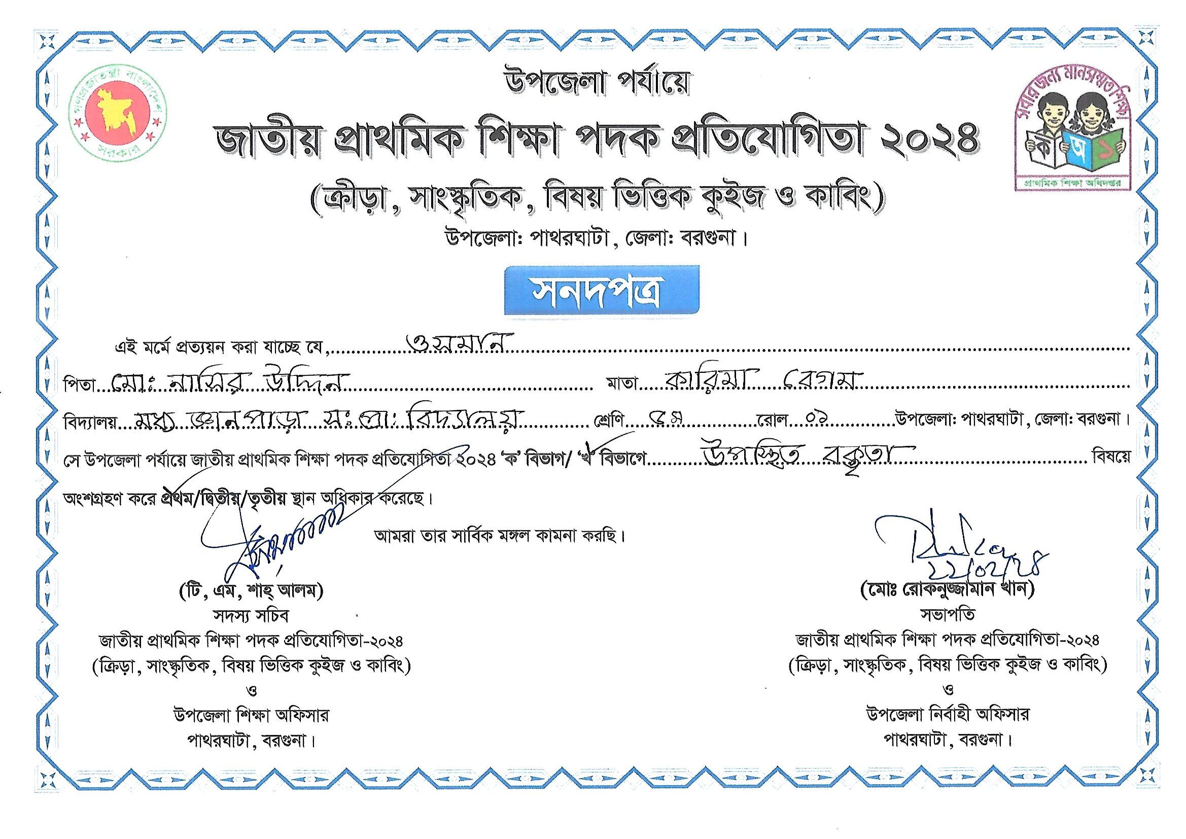২০২৪ সালে পাথরঘাটা উপজেলার ১৪৯ টি প্রাথমিক বিদ্যালয়ের শত শত শিক্ষক প্রতিযোগিকে পিছনে ফেলে প্রাথমিক বিজ্ঞান বিষয়ের মাস্টার ট্রেইনার হওয়ার গৌরব অর্জন করেন অত্র বিদ্যালয়ের সহকারী শিক্ষক জনাব ইমরান খান।